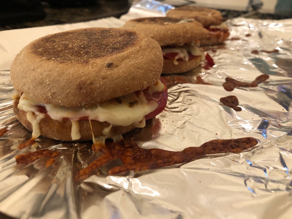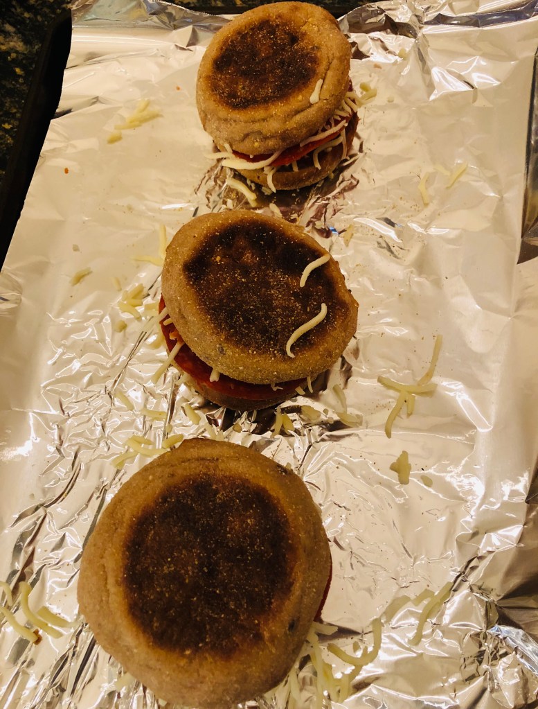 Another school lunch idea! I used to love english muffin pizzas as a kid, but they don’t travel well in lunch boxes because the cheese is messy so I invented the english muffin pizza sandwich! I used Dave’s Bread English muffins (homemade are on my list try, but I haven’t gotten around to it yet), marinara, shredded mozzarella, and uncured pepperoni. Assemble them like pictured, as a sandwich, so the cheese doesn’t stick to your packaging. Bake them on parchment paper (not aluminum foil like I did because they will stick!) on 350 degrees until cheese is melted and tops are golden brown. Let cool on a paper towel on top of aluminum foil that you can use to wrap for lunch. Yum! And even pre-teen kid approved.
