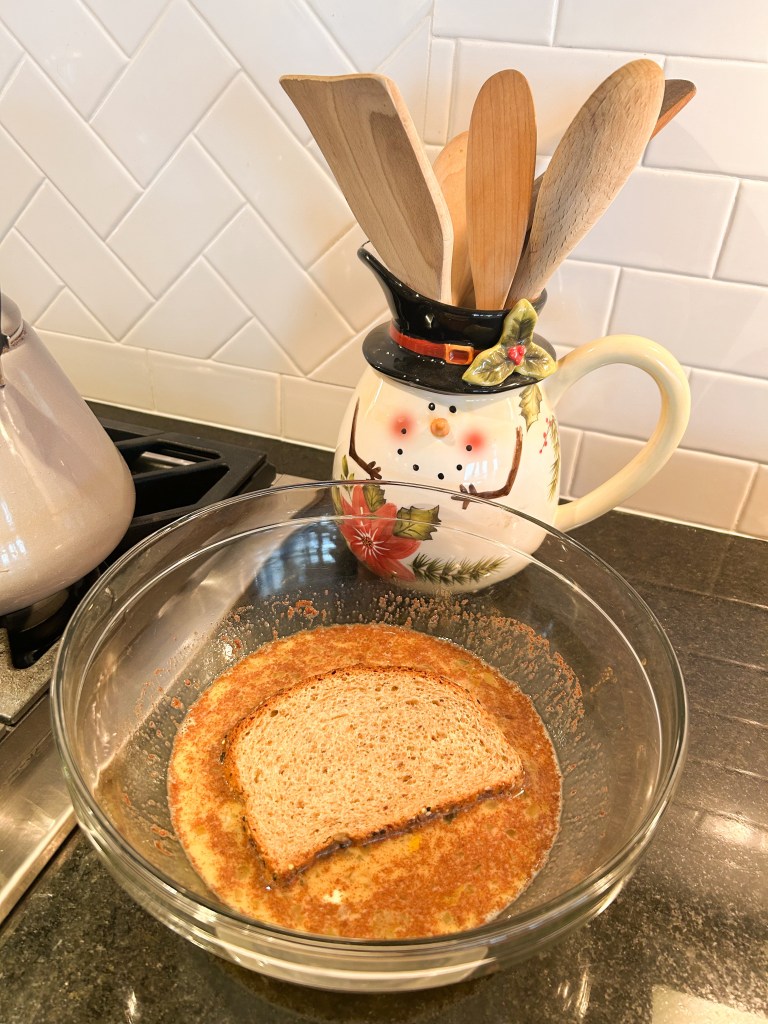 Remove from the pan and repeat with remaining pieces of bread. Re-mix the liquid before dunking each new piece or two of bread.