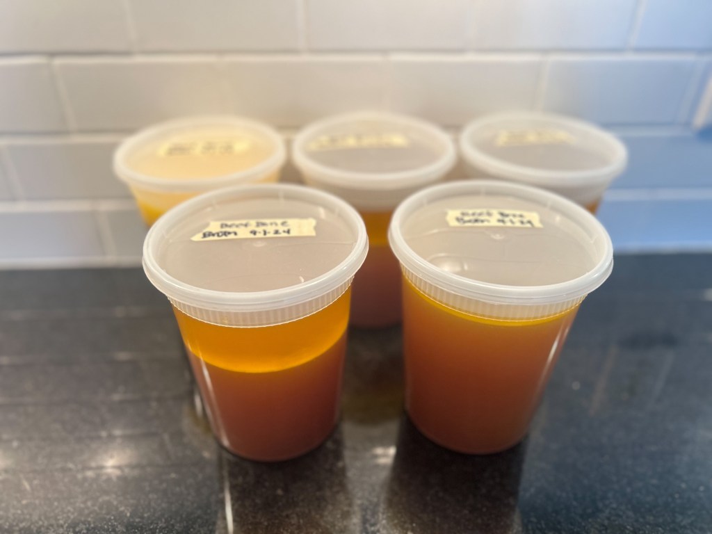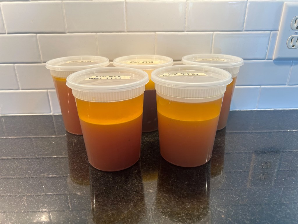 Pour remaining contents of broth through the strainer. Toss the solids and pour the liquid into ball jars or plastic quart size containers (or any container of choice). Freeze or use in soups, or in place of water for rice.