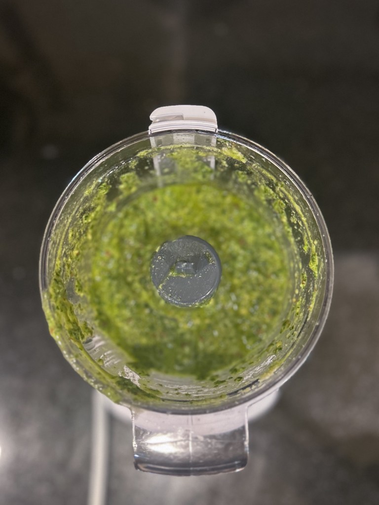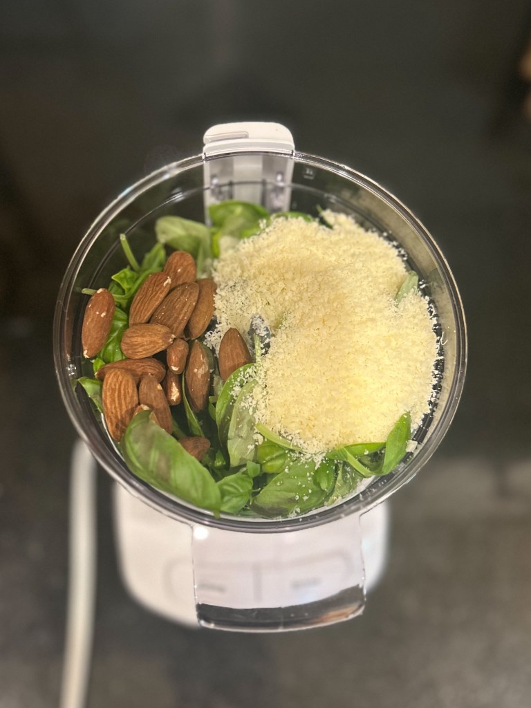 This pesto is from my favorite food blogger, alexandracooks.com. Her recipes are always good and often taste like you are eating your meal at a restaurant. They are also simple and practical and she often has substitution options, which is perfect for me. I was growing tired of the same old thing for dinner and since it is summer, I noticed the basil is plentiful! We don’t have a garden for the first time in over 10 years (so sad, but the kids are in their busy season of life so we figure we will pick it up again when life slows down), but I was able to get some delicious basil anyway. I only made a small batch because I didn’t buy enough basil so next time, I will be sure to get more.