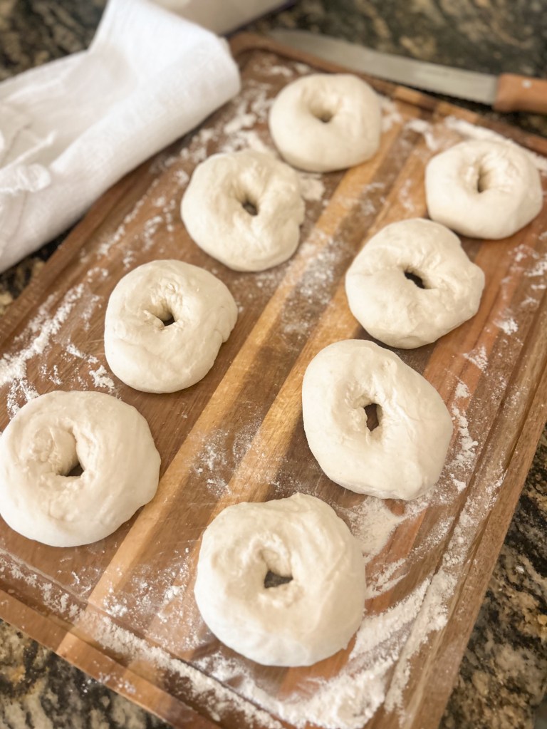 Divide into 8 equal pieces and roll each into a ball. Poke a hole in the middle and smooth out into bagels shapes. Let sit in floured surface to rest for 15-30 minutes or while your water boils.