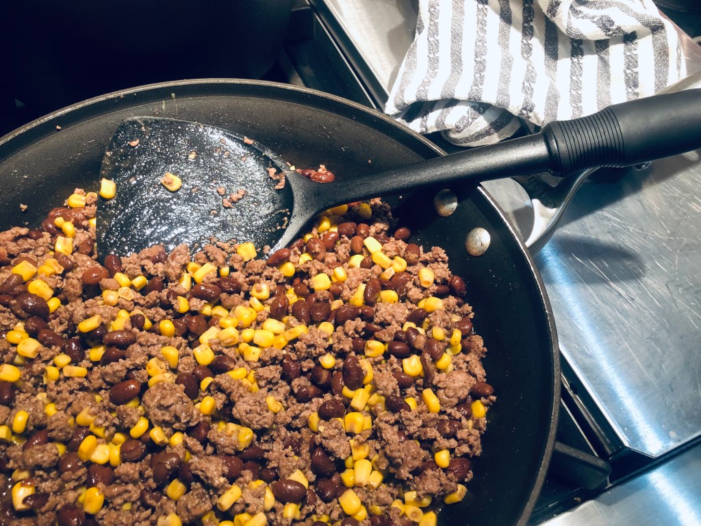Once meat is mostly done, add in corn and beans and mix well. Option to add other veggies (peppers, zucchini) now and sauté with meat, corn and beans until cooked.