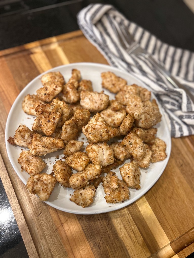 Chicken is so hard for me to cook well on the stove or in the oven without drying it out. We prefer grilled chicken, but my husband does all of the grilling so on busy weeknights and when he is gone, I need an alternative to grilling. I adapted this recipe to fit our dietary needs and because my daughter wanted a chicken Caesar salad and my husband was at baseball practice. These little nuggets tasted so good alone and in our salad! They are an air-fryer recipe that I adapted from skinnytaste.com and it worked great. They were fairly easy to make and all of my kids liked them. We even have leftovers that could easily be frozen, but I think ours will get eaten before that happens.
