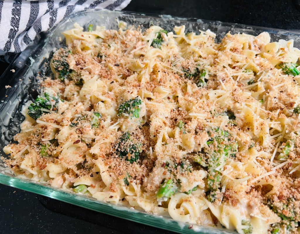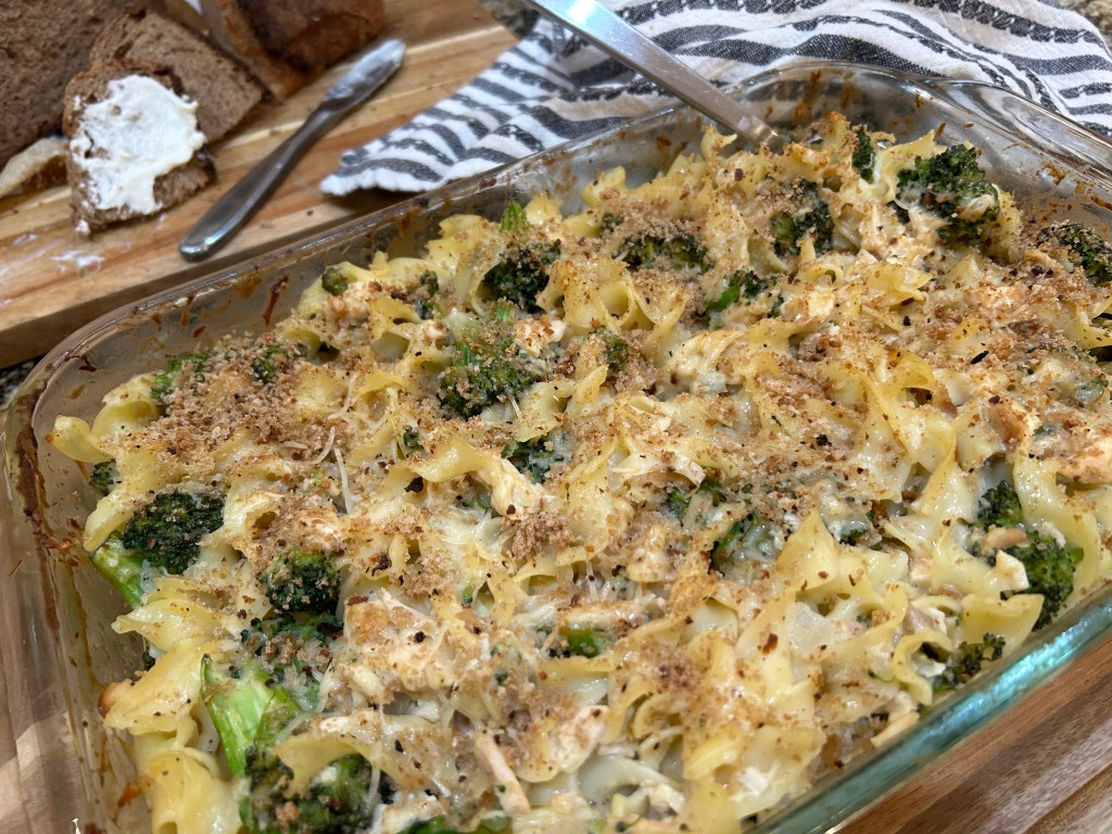 Bake for 20 -25 minutes or until warmed through and then place under a broiler for a minute to get the crumbs crisp. Check periodically so it doesn’t dry out, you may want to take out after 15 minutes.
