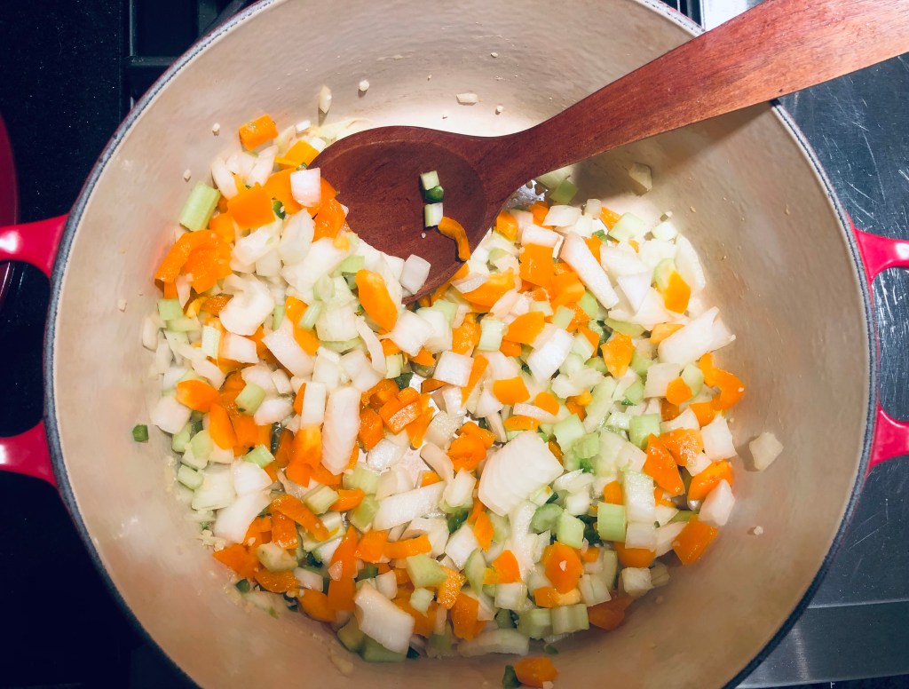 Saute onions, peppers, celery, jalapeños and garlic in oil in a large Dutch oven or deep skillet until softened.