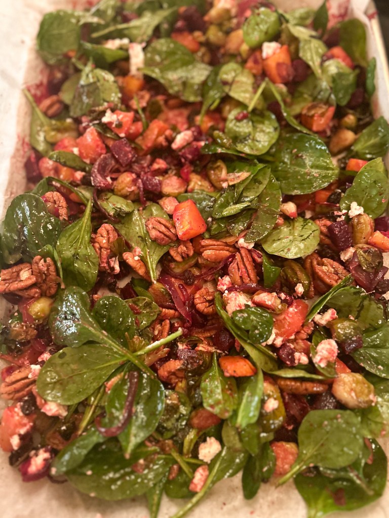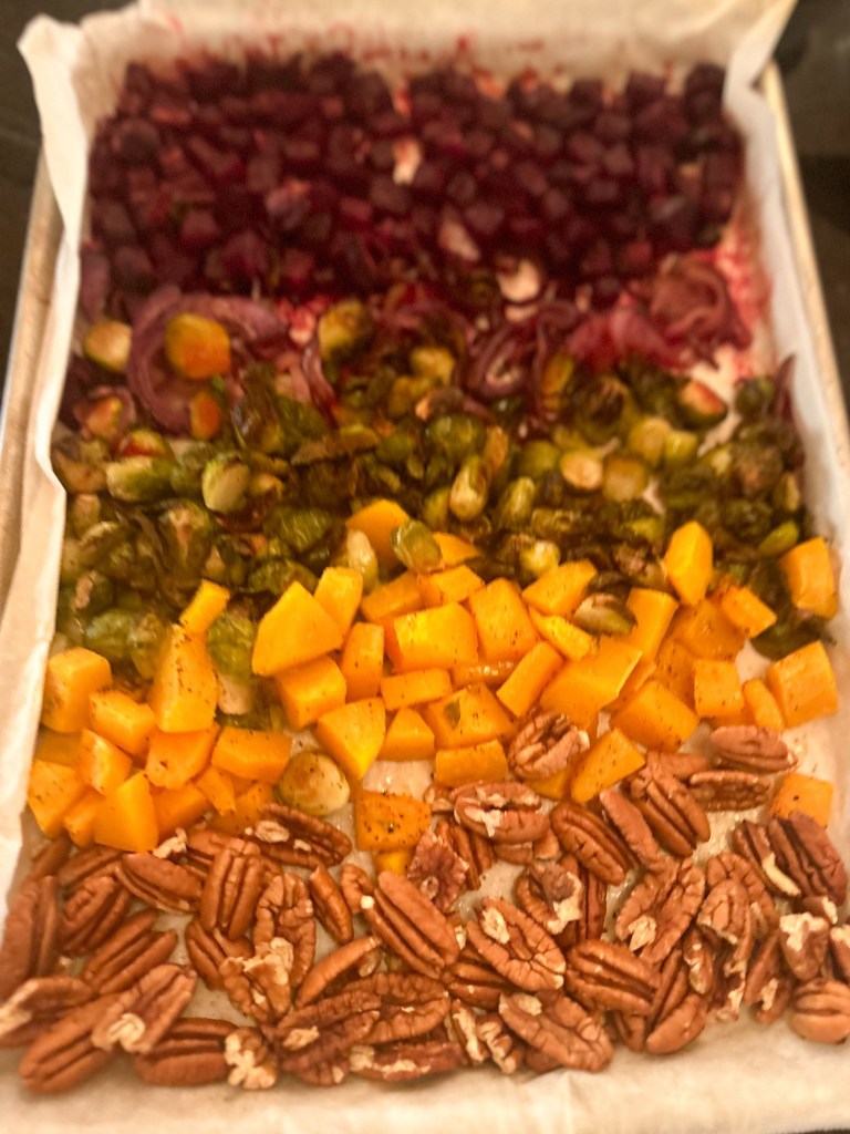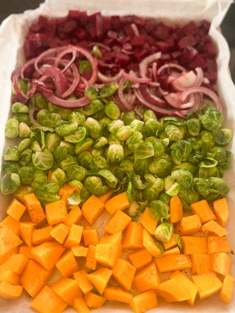 This is made the same way as my roasted sheet pan winter salad, but I changed up the vegetables a little bit. It is so hearty and filling that it could actually be a main course. The beauty of this dish is that you can change up the vegetables based on what you have on hand or what you like. Just make sure the oven roasting time is similar for each vegetable. Beets take a little longer to roast so you could put those on first or chop them really small to decrease the cooking time. Even my husband liked this!