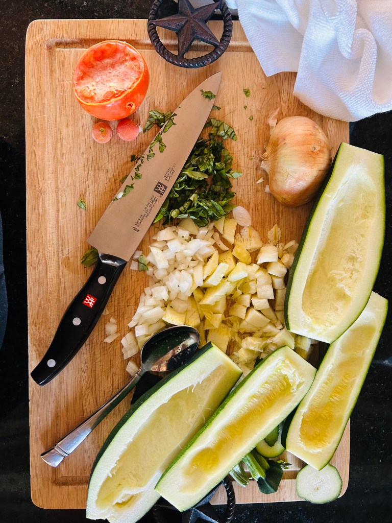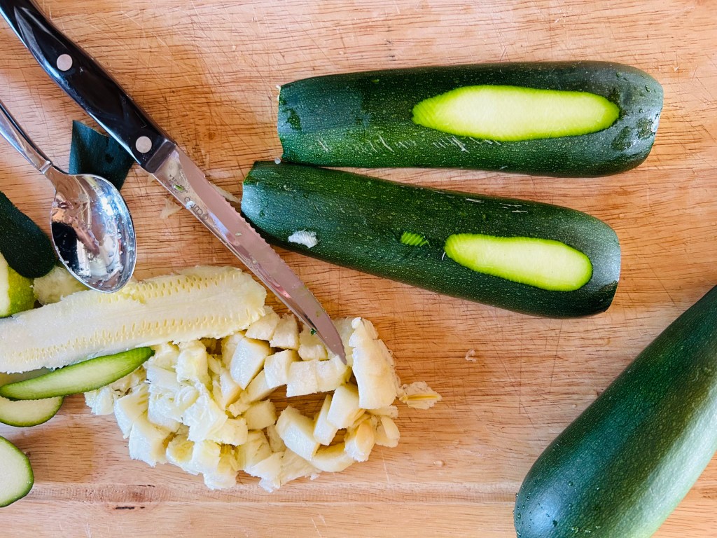 Cut zucchini in half, longways. Slice a small sliver off the bottom of the boat so that your boat will sit flat in your baking dish. Scoop out zucchini and seeds to form a boat. Place in a greased baking dish or on a parchment lined cookie sheet.
